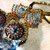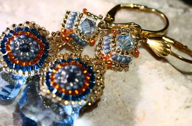 Die blauen Glasschliff-Tropfen sind von beiden Seiten gleich schön, mit den zahlreichen Miniperlen, eingefasst.