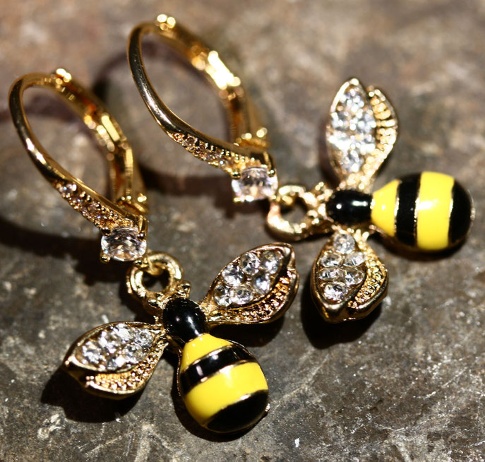 Die bezaubernden Bienchen sind aus Emaille. Beim Emaillieren wird bunte Glasschmelze in das Metall gebrannt, dadurch bleibt der Schmuck dauerhaft strahlend schön. Der Ohrschmuck ist sehr detailgenau angefertigt und mit funkelnden Strass-Steinchen verziert.