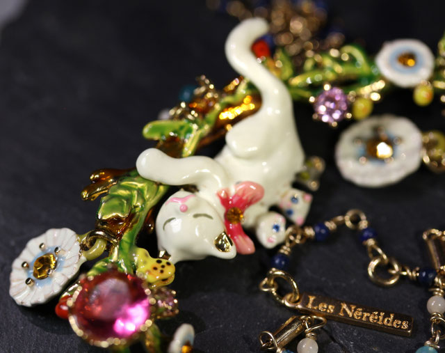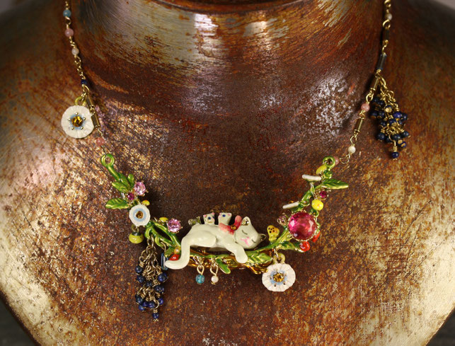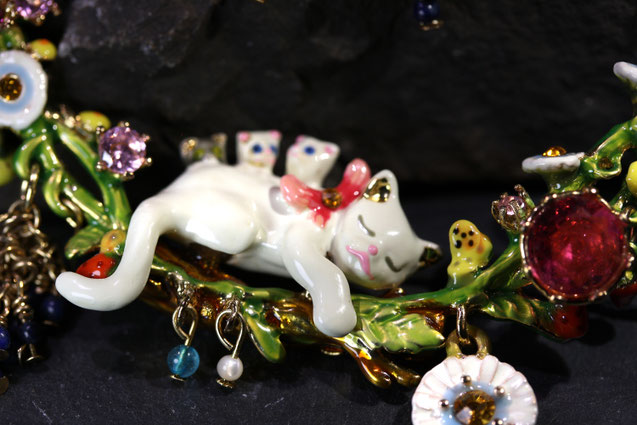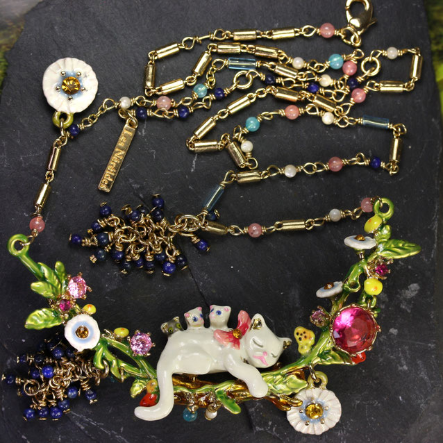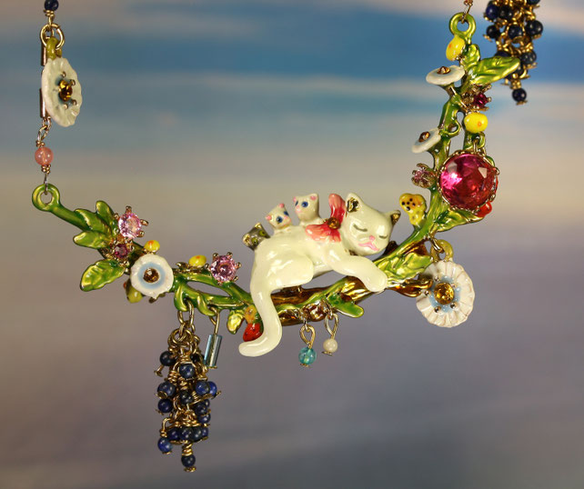 Diese außergewöhnlich beeindruckende Emaille-Halskette wurde in feinster Qualität hergestellt. Das Motiv - Katzenmami mit Babys -(eines davon ist dunkel), ist ganz bezaubernd dargestellt. Ein wirklich seltenes Schmuckstück zum Verlieben.