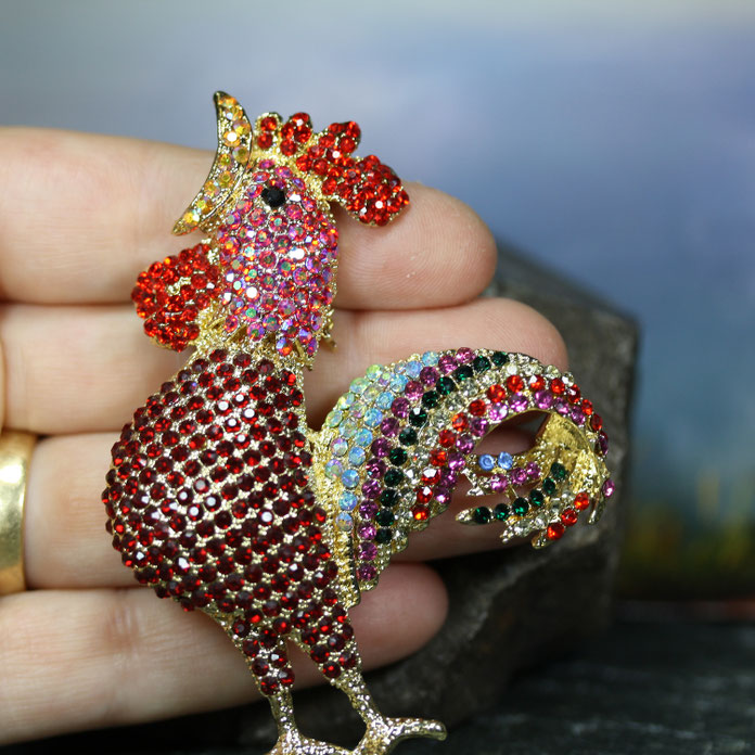 Die große Brosche ist üppig mit Glitzersteinchen besetzt. Die Farben der funkelnden Strasssteinchen sind harmonisch aufeinander abgestimmt. Das Strahlen und Funkeln dieser imposanten Brosche ist im Foto kaum einzufangen. Die Brosche wirkt, trotz des lustig bunten Motivs, sehr edel und die lebendige Form ist ein wahrer Blickfang.