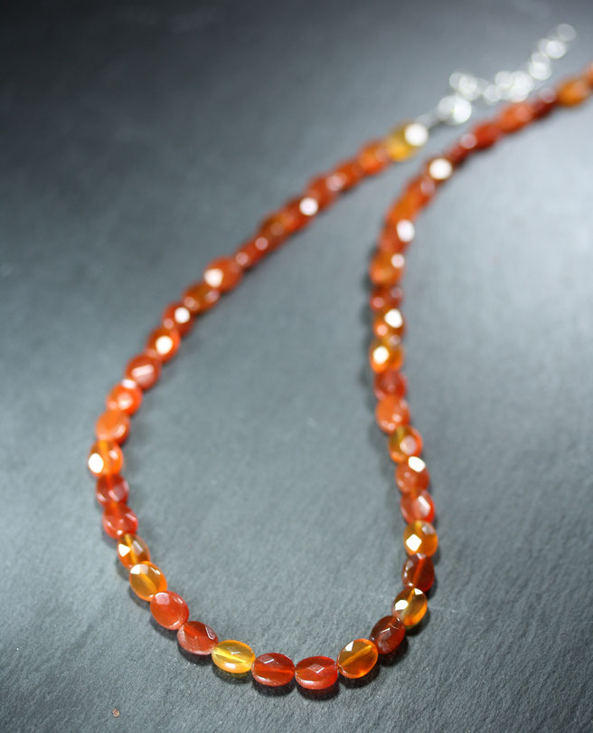Diese zauberhafte Halskette besteht aus echten Karneol-Edelsteinen in warmen Orange- bis Rottönen. Jeder Edelstein ist sorgfältig facettiert geschliffen und entfaltet so ein funkelndes Farbspiel, das an Sonnenuntergänge erinnert. Diese Kette ist mehr als nur Schmuck, sie ist Ausdruck von Selbstbewusstsein und Lebensfreude.