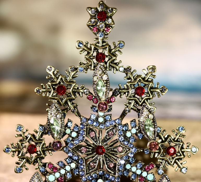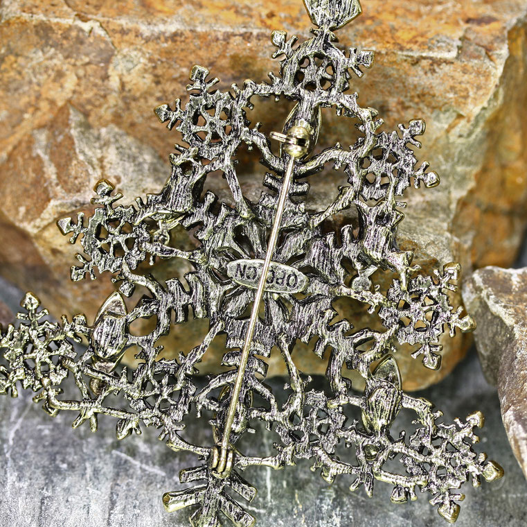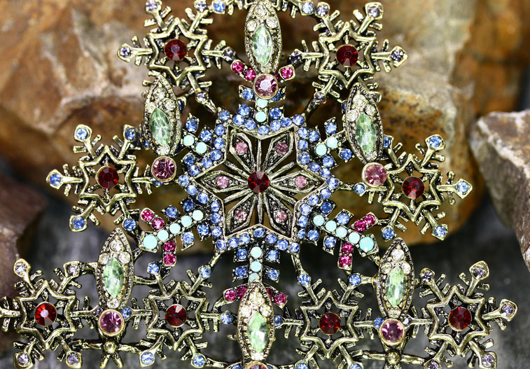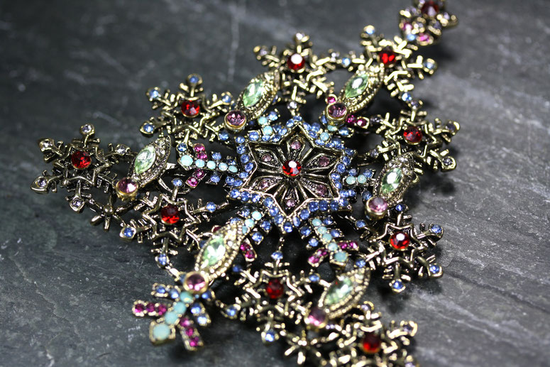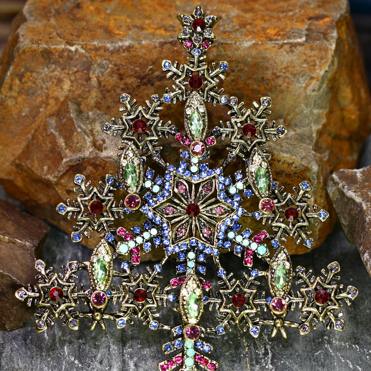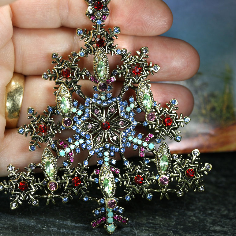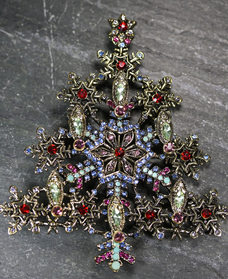Diese prunkvolle, nostalgische Riesenbrosche ist ein wahres Highlight. Der imposante Glitzerbaum ist eine meiner Lieblingsbroschen. Ich trage sie am liebsten an einem dicken Schal oder an einem kuschligen Wollmantel und dann ab zum Weihnachtsmarkt. Auf der Rückseite befindet sich eine sichere, große Nadelschließe.