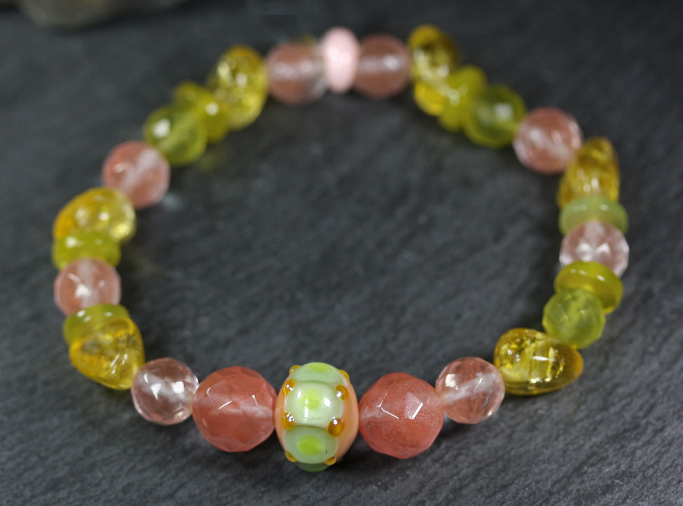 Verwendete Materialien: Handgefertigte Glasperle, Cherryquarz, Peridot