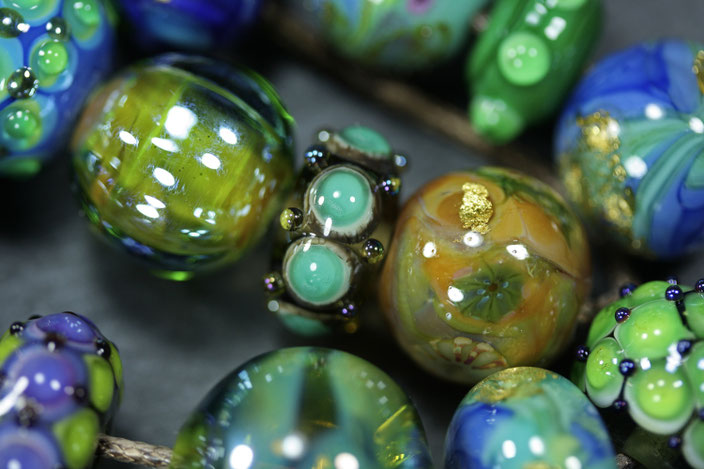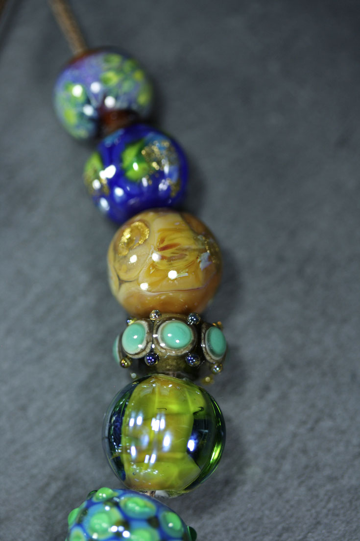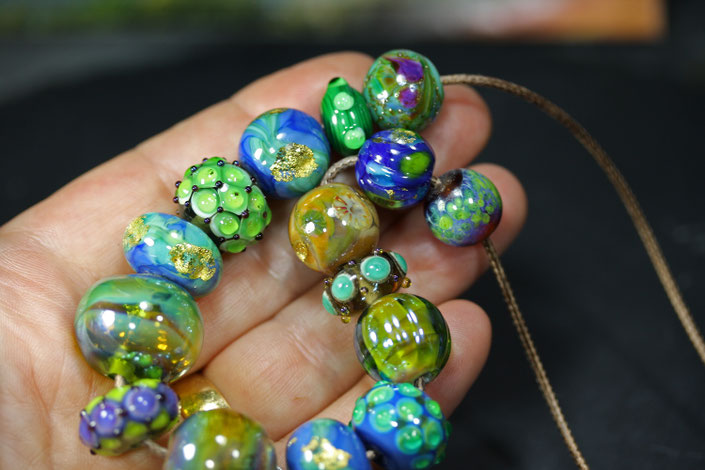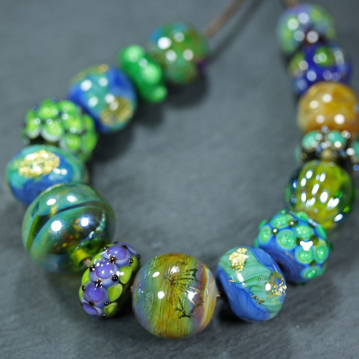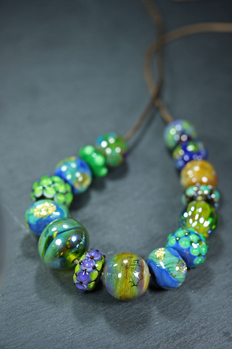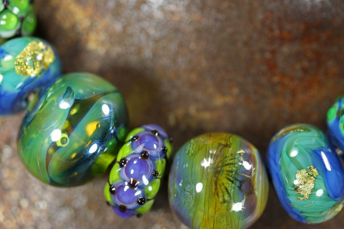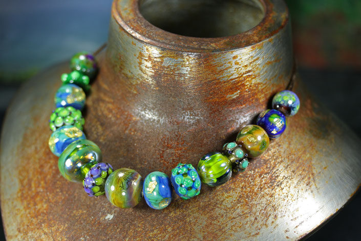 Dieser Halsschmuck ist ein echtes Highlight. Jede einzelne Perlen ist eine kleine Kostbarkeit. Einige der Glasperlen enthalten feine Einschlüsse aus echtem Gold, die dem Halsschmuck einen dezenten Hauch von Luxus verleihen. Aneinandergereiht bilden die kunstvollen Glasperlen ein wunderschönes Ensemble am Dekolleté.