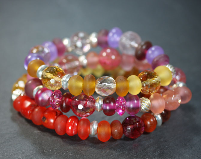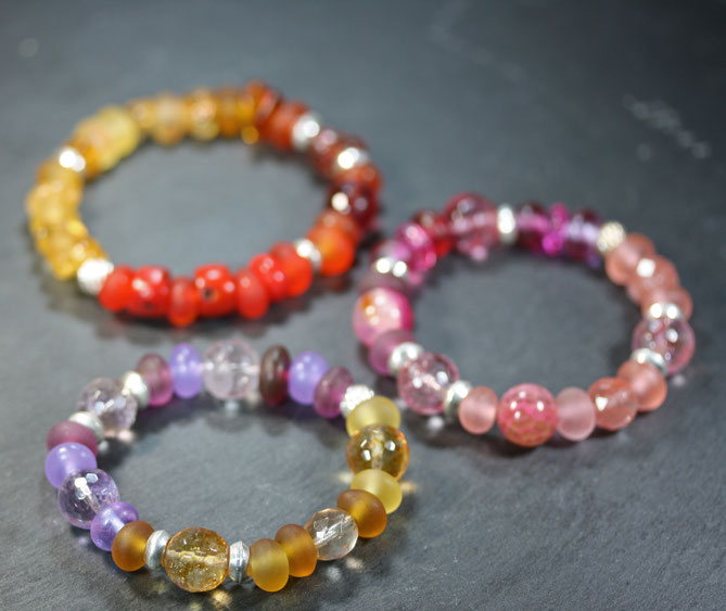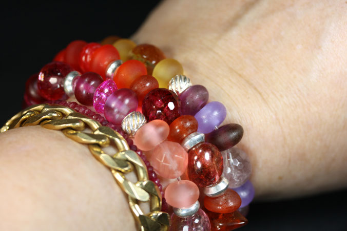 Aufgefädelt wird der Armschmuck auf ein dickes, hochwertiges Silikon-Gummiband. Es ist mit Abstand die bequemste Variante dein Armband täglich blitzschnell an- und abzulegen. Damit du lange Freude an deinem Schmuck hast, achte ich vor der Fertigstellung sorgfältig darauf, dass die Fädelkanäle aller Perlen rund und glatt sind. So wird das Gummiband geschont und bleibt dauerhaft haltbar.