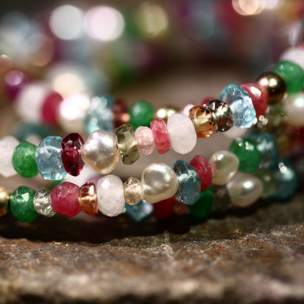 Die facettiert geschliffenen Edelsteine funkeln wunderschön und verleihen der Halskette trotz der farbenfrohen Steine eine hochwertige, edle Ausstrahlung – ein Schmuckstück für die Ewigkeit.