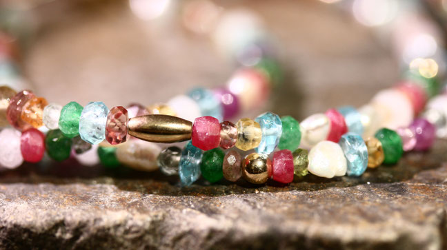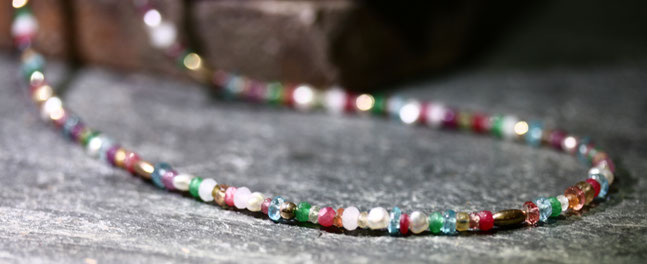 Diese zarte Kette besteht aus feinsten Edelsteinen (Rubin, Saphir, Peridot, Citrin...), Süßwasserperlen und Perlen aus echtem Gold. Insgesamt sind 11 333er-Goldperlen in Kugel- und Olivenform eingefädelt, die der Kette einen eleganten Akzent verleihen.