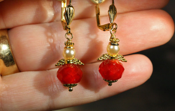 Schutzengel sind verlässliche Gesellen, um so besser, wenn man die kleinen Schützlinge direkt bei sich trägt - hier als schöner Ohrschmuck mit facettierten Glasschliff-Perlen. Die Perlen sind halbtransparent und schimmern wunderschön samtig Rot.