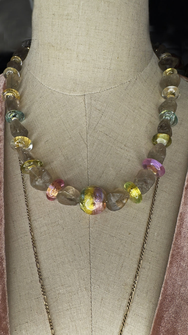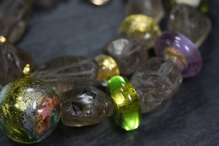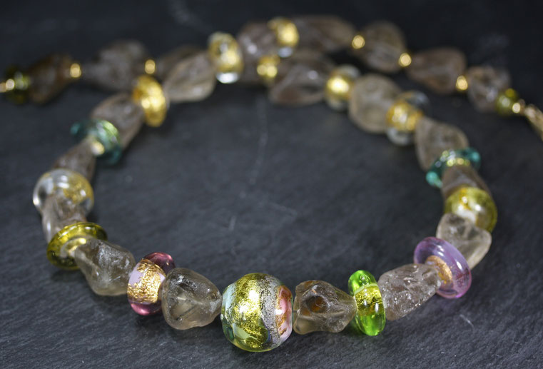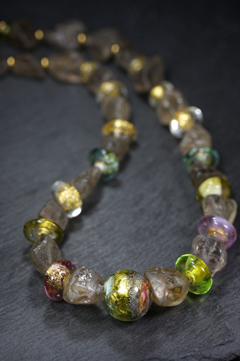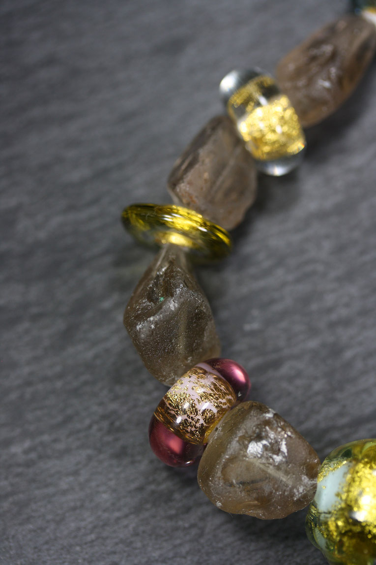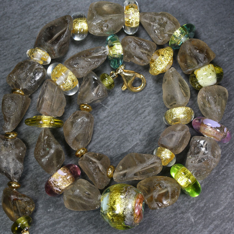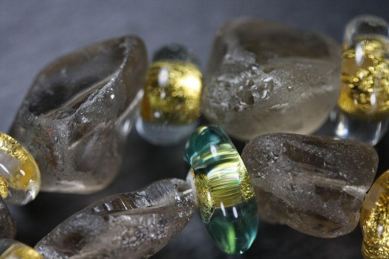 Natürlicher, halbmatter Rauchquarz trifft auf funkelnde, handgefertigte Glasperlen, in denen üppig 24 Karat Gold schimmert.
