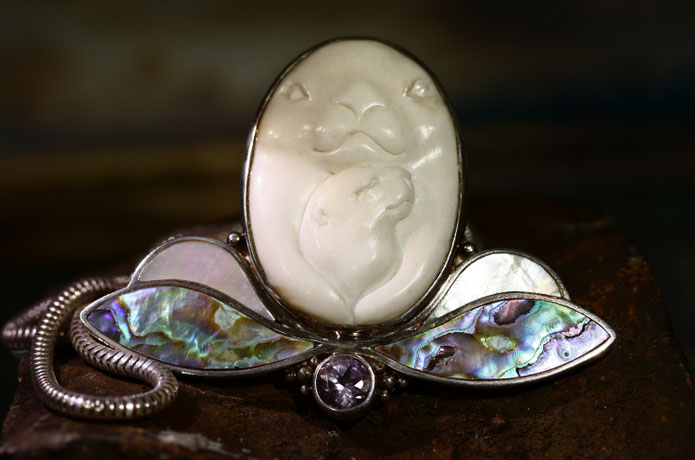 Das Schmuckstück ist zweifellos eine Rarität. Handgefertigte aus hochwertigen Materialien und mit einem wunderschönen, seltenen Motiv, eine Robbenmutter mit ihrem Baby. Das Schmuckstück ist Kettenanhänger und Brosche in einem und wirkt durch seine imposante Größe sehr glamourös, aber trotzdem trägt sich das Schmuckstück bequem und gut anliegend am Dekolleté. Die Schnitzerei wurde aus weißem Achat angefertigt und wird von dem bunten Farbenspiel der Abalone-Perlmuttmuschel unterhalb umrahmt.