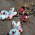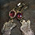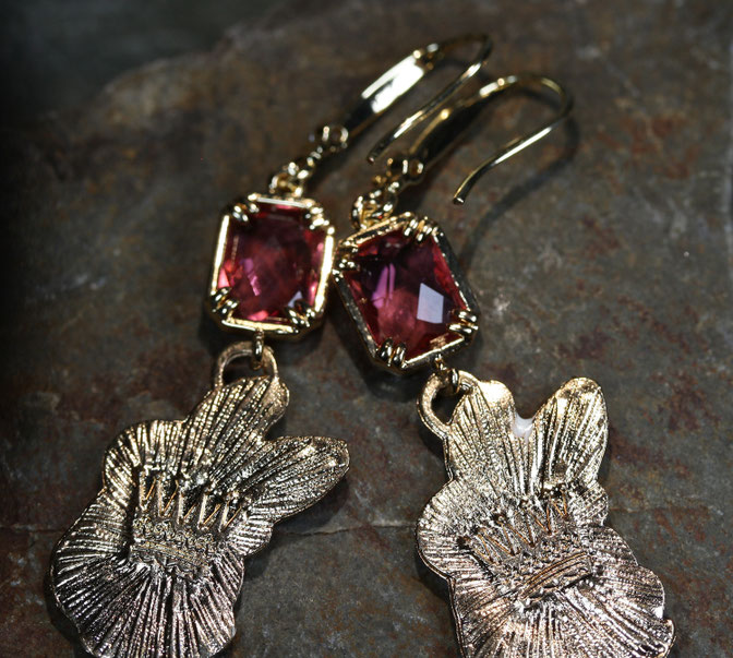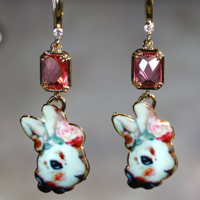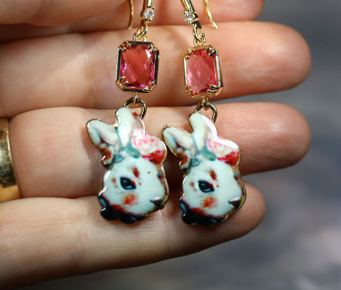 Ich habe die emaillierten Häschenköpfe mit wunderschön funkelnden, rubinrosafarbenen Glasschliff-Steinen kombiniert.
