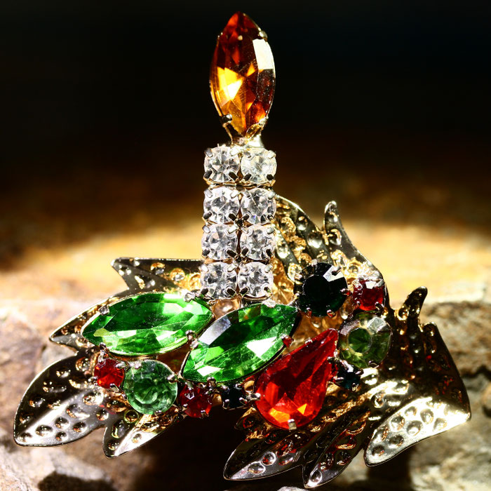 Ein wahrer Hingucker ist diese festliche Brosche mit der funkelnden Kerze. Die Brosche wirkt durch die facettiert geschliffenen Glassteine sehr edel. Auf der Rückseite befindet sich eine sichere Nadelschließe.