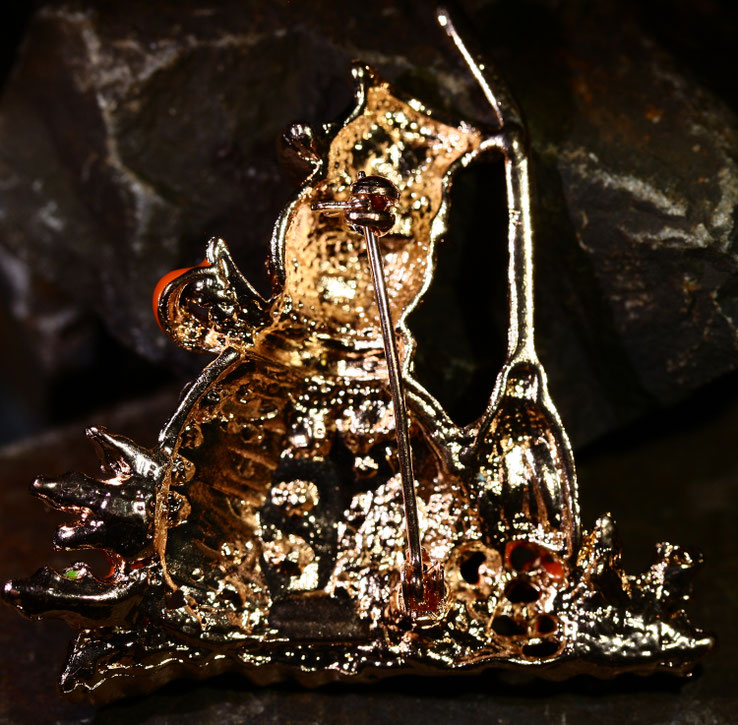 Dieser niedliche Schneemann ist sehr detailgenau angefertigt. Die Brosche ist zum Teil emailliert und üppig mit funkelnden Strass-Steinen besetzt. Auf der Rückseite befindet sich eine sichere Nadelschließe.