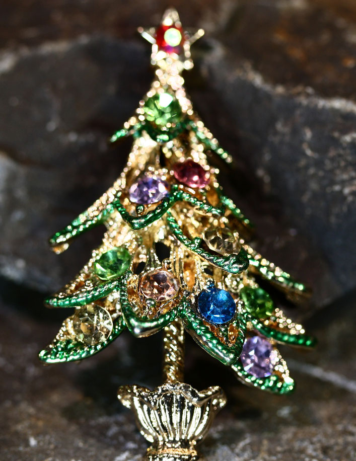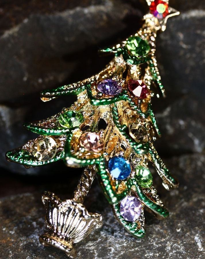 Der leuchtende Weihnachtsbaum ist mit Glasschliff-Steinen in zarten Pastellfarben besetzt. Auf der Rückseite befindet sich eine sichere Nadelschließe.