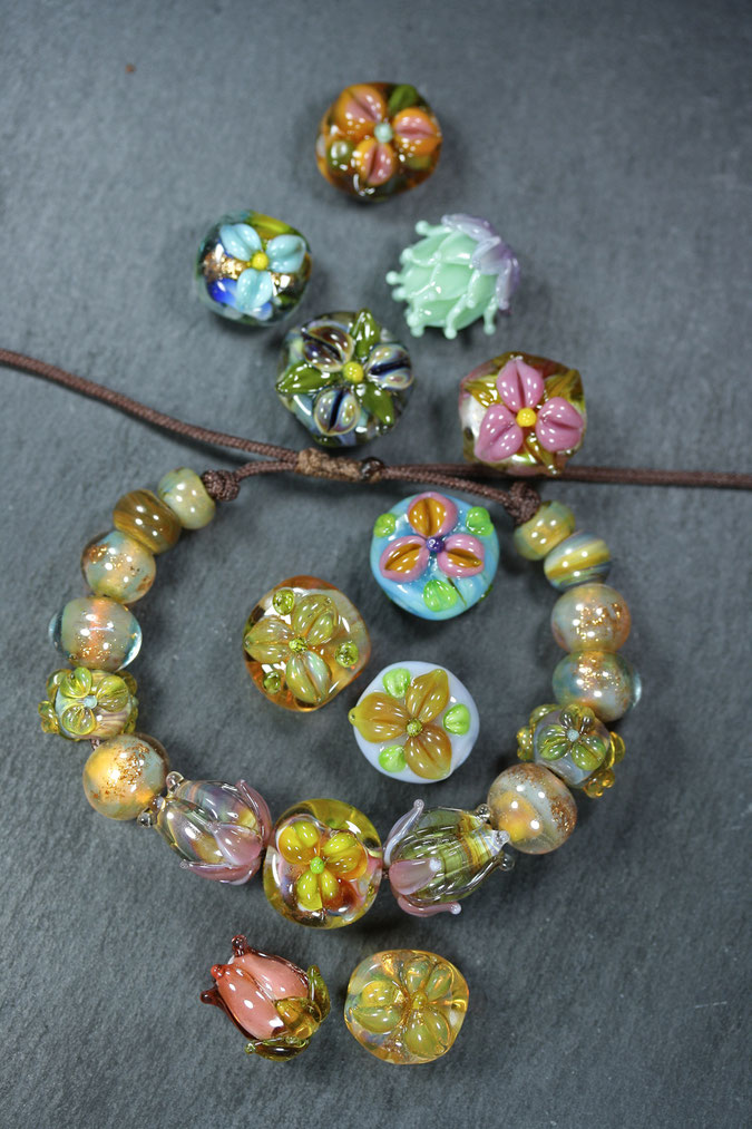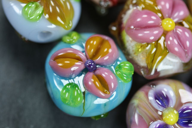 Meine Blumenkissen-Glasperlen sind rundherum hübsch anzusehen, denn ich habe jeweils zwei Blüten eingearbeitet – eine auf der Vorderseite und eine auf der Rückseite.
