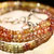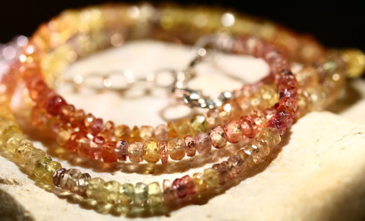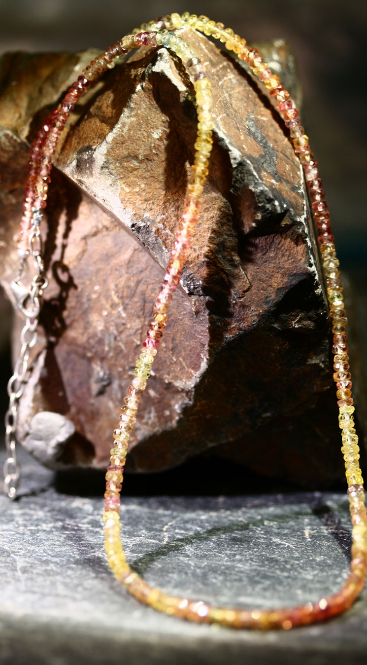 Die Halskette erstrahlt in warmen harmonischen Farbtönen - von zartem Gelb über sanfte Rosanuancen bis hin zu sattem Orange.