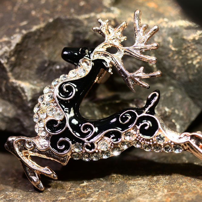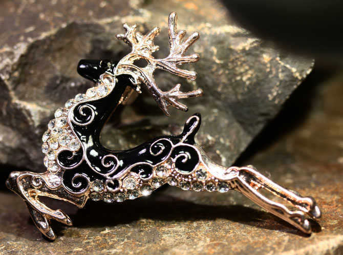 Die reich verzierte, niedliche Brosche ist emailliert und mit Strass-Steinchen besetzt.