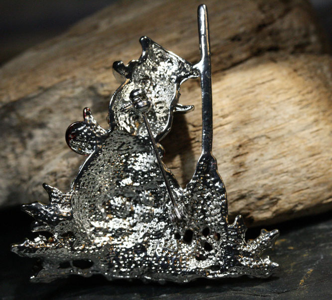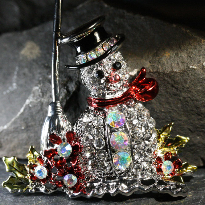 Dieser niedliche Schneemann ist sehr detailgenau angefertigt. Die Brosche ist zum Teil emailliert und üppig mit funkelnden Strass-Steinen besetzt. Auf der Rückseite befindet sich eine sichere Nadelschließe.