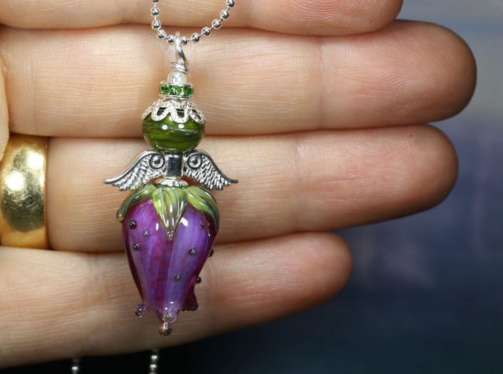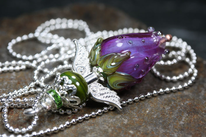 Aus feinstem Muranoglas geformt, gleicht der Rumpf des Engels einer zarten Rosenknospe - Sinnbild des Neubeginns und der stillen Entfaltung. Hier verschmelzen zwei Symbole zu einem Schmuckstück. Die Blütenknospe, die dem Licht entgegenstrebt und der Engel, der dich sanft und schützend durch alle Höhen und Tiefen des Lebens begleitet.