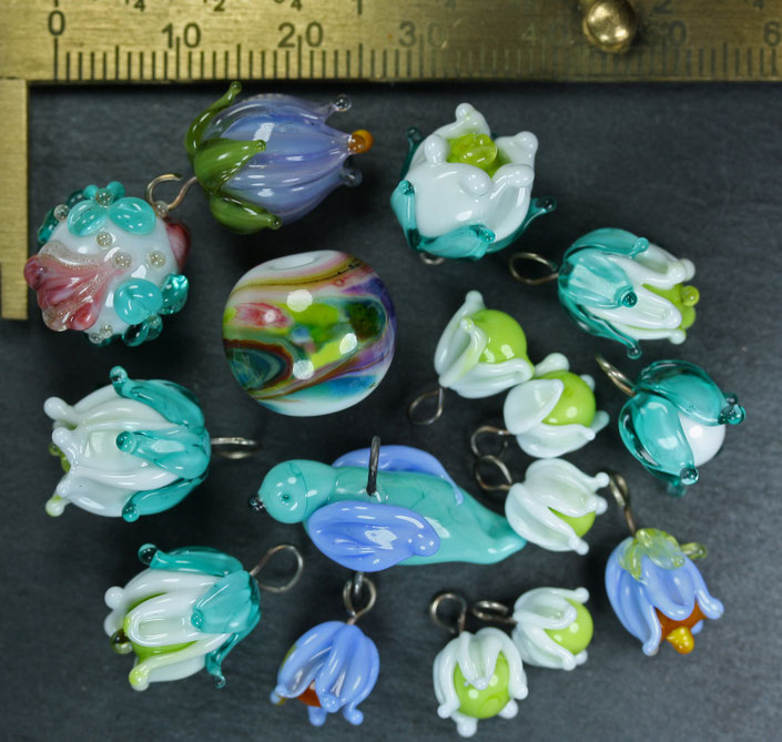 Anzahl: 16 Stück handgefertigte Unikat-Glasperlen/ Anhänger mit Öse