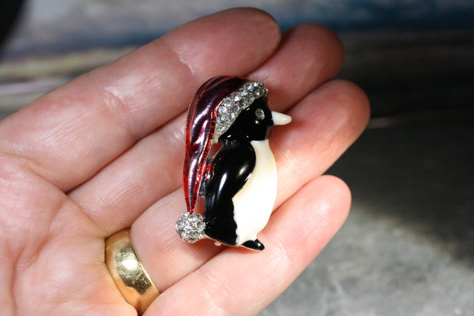 Der niedliche Pinguin mit langer Zipfelmütze ist farblich emailliert und mit Strass besetzt.