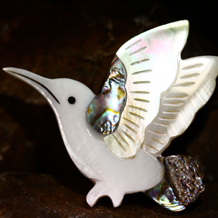 Der hübsche, handgeschnitzte Vogel besteht aus echtem Perlmutt.