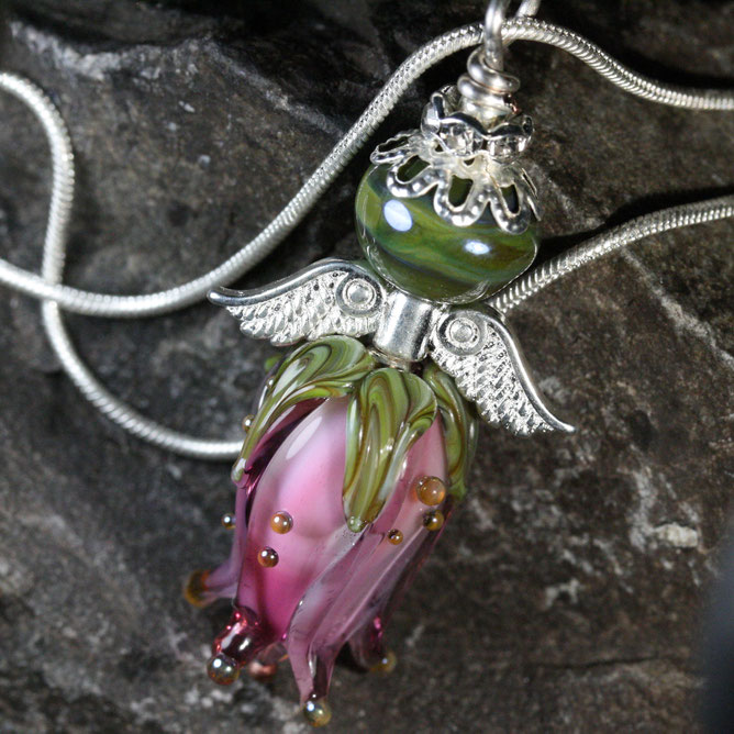 Aus feinstem Muranoglas geformt, gleicht der Rumpf des Engels einer zarten Rosenknospe - Sinnbild des Neubeginns und der stillen Entfaltung. Hier verschmelzen zwei Symbole zu einem Schmuckstück. Die Blütenknospe, die dem Licht entgegenstrebt und der Engel, der dich sanft und schützend durch alle Höhen und Tiefen des Lebens begleitet.