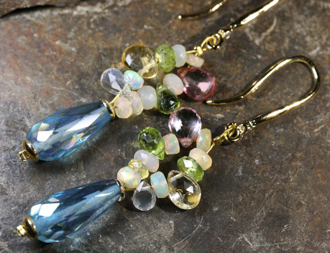 Der Ohrschmuck besteht aus hochwertigen, echten Edelsteinen. Er ist äußerst leicht und flexibel. Durch den facettierten Schliff der feinen Edelsteine funkelt und glitzert der Ohrschmuck in zauberhaften, zarten Farbtönen. Ich habe Opale, Citrin, Peridot und Pink-Topas verwendet. Der große untere Tropfen besteht aus einem türkis-blauem Aqua-Aura Bergkristall.
