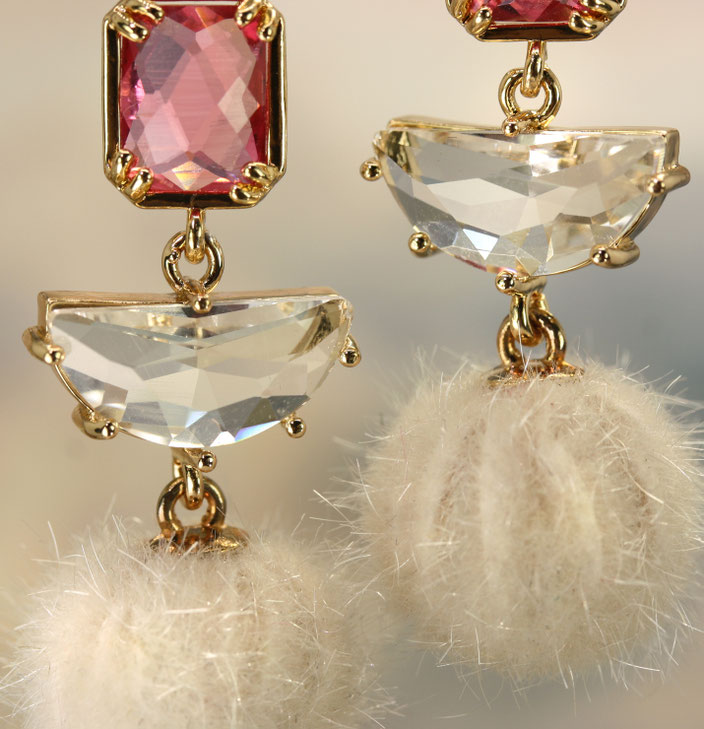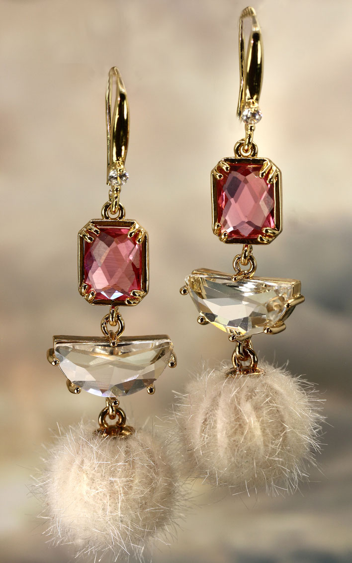 Der Kontrast zwischen den flauschigen Kugeln und den funkelnden Glasschliff-Elementen verleiht diesem Schmuckstück ein interessantes Erscheinungsbild.