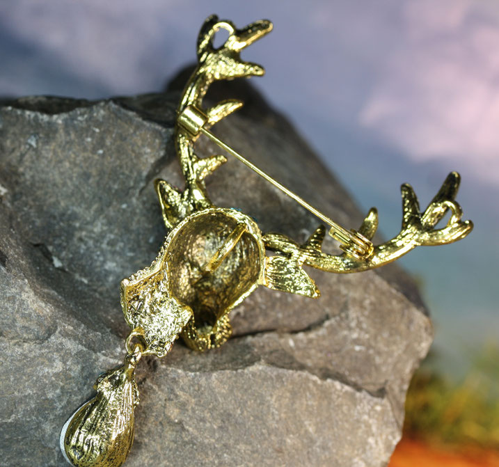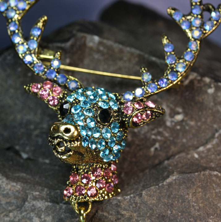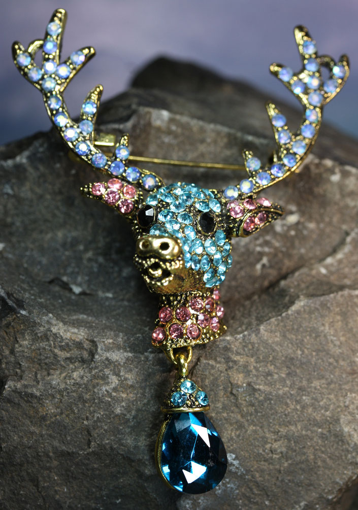 Die festliche Brosche funkelt und glitzert in Rosa, Blau und Türkis. Der große Kristalltropfen ist beweglich. Auf der Rückseite befindet sich eine sichere Nadelschließe und eine große Fädel-Öse. Dadurch kannst du das Schmuckstück als Brosche oder als Kettenanhänger tragen.