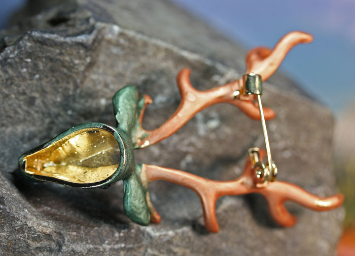 Die Brosche ist matt emailliert, dadurch wirkt sie unaufdringlich elegant. Auf der Rückseite befindet sich eine sichere Nadelschließe.