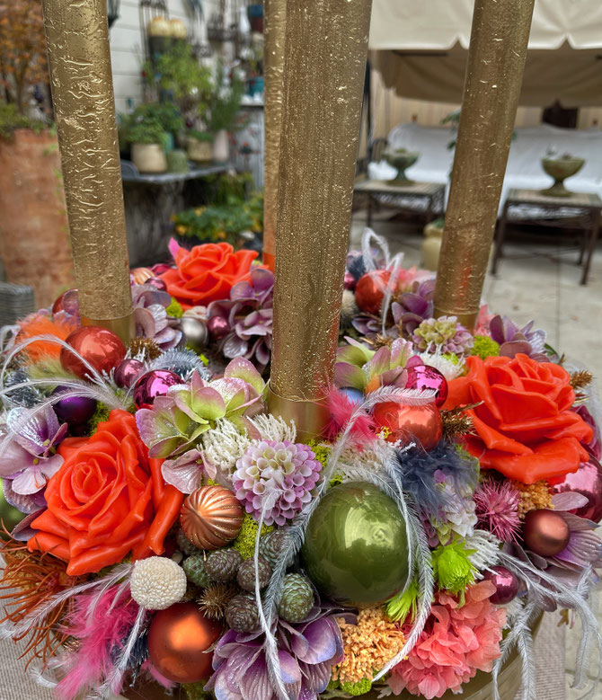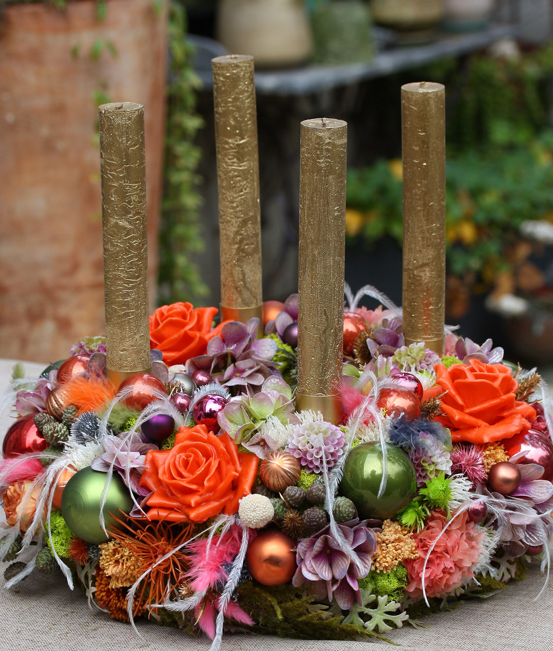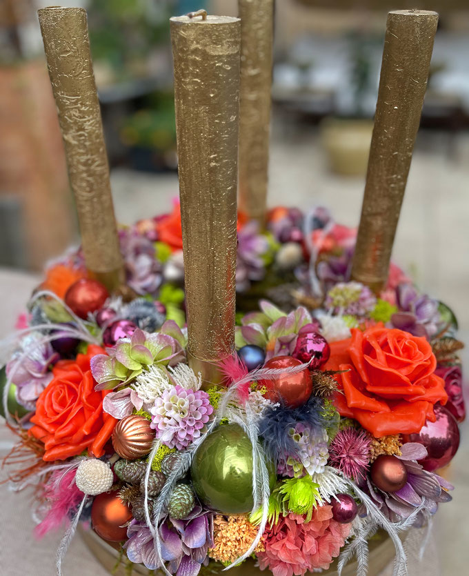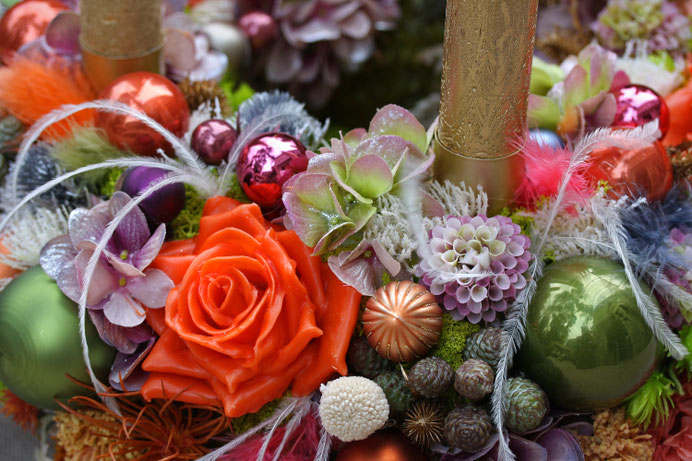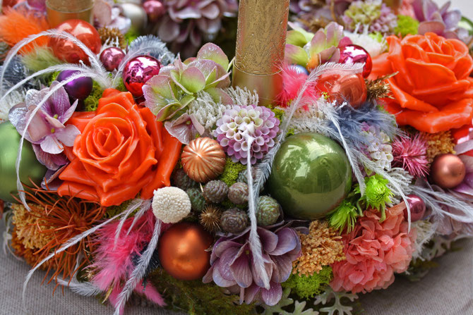 Materialen: Christbaumkugeln, Wachsrosen, natürliche Blüten (haltbar gemacht) und Kunstblumen u.v.m.
