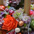 Maße. Durchmesser 45 cm, Höhe 20 cm, orangefarbene Wachsrosen ca. 10 cm, grüne Kugeln ca. 6 cm