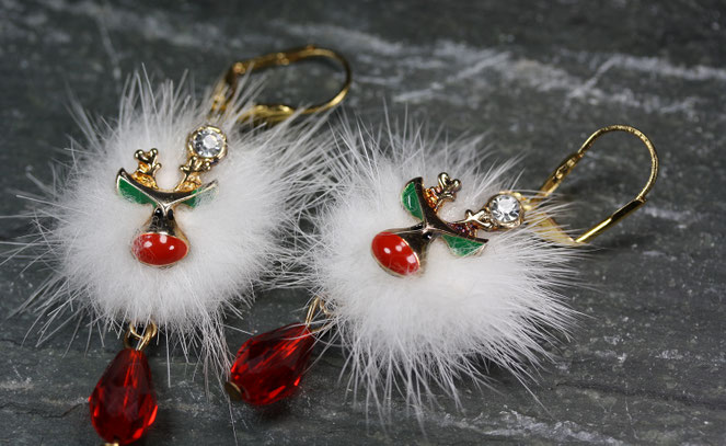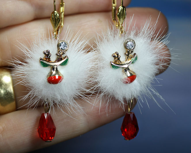 Die weißen Puschel sind aus Kunstfell. Die Ohrhaken sind mit sicheren Klapp-Brisuren versehen.