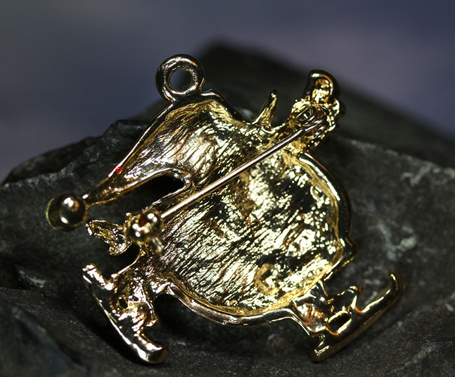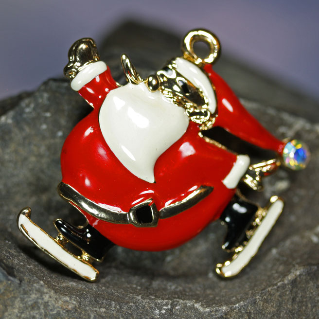 Der drollige kleine Kerl kommt auf Schlittschuhen daher. Die Brosche kann auch als Kettenanhänger getragen werden. Oben befindet sich eine große Fädelöse und auf der Rückseite befindet sich eine sichere Nadelschließe. Am Ende der Zipfelmütze funkelt ein bunt schimmernder Glaskristall.