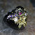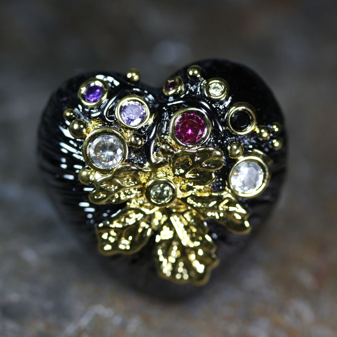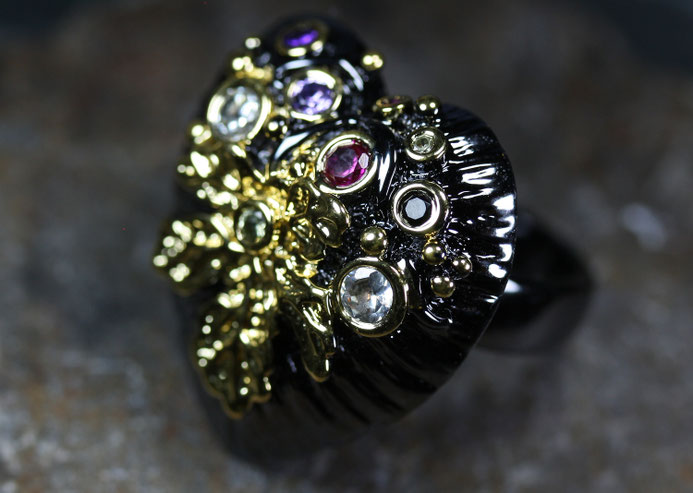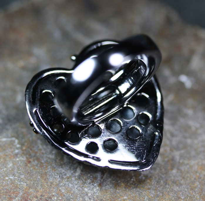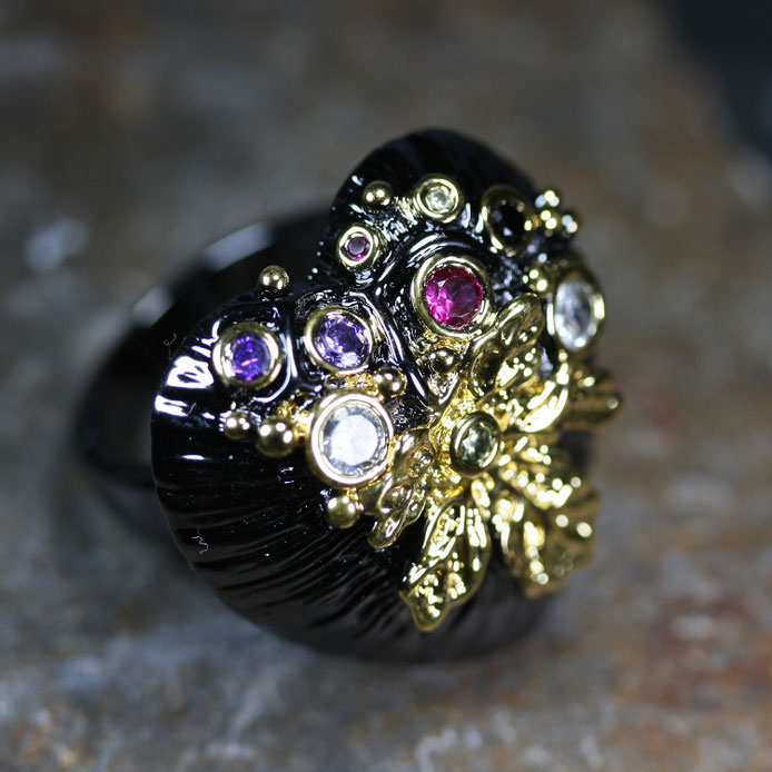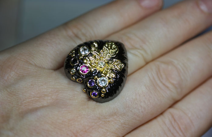 Auf dem schwarzen Untergrund sind goldene Eichenblätter und fein geschliffenen Glaskristalle aufgebracht. Der Ring ist von höchste Qualität und wirkt sehr edel.